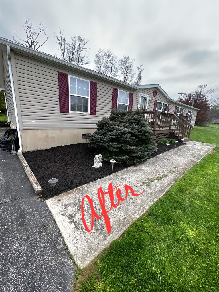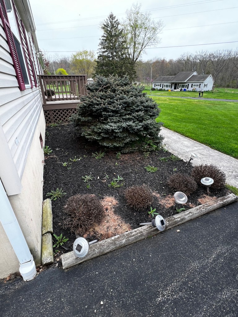 In this Job, we relined and added mulch to this flower bed, pruned shrubbery, and added fresh plants to replace the dried out plants you see in the first image.